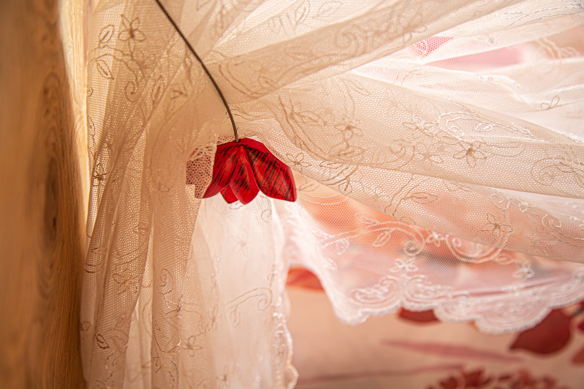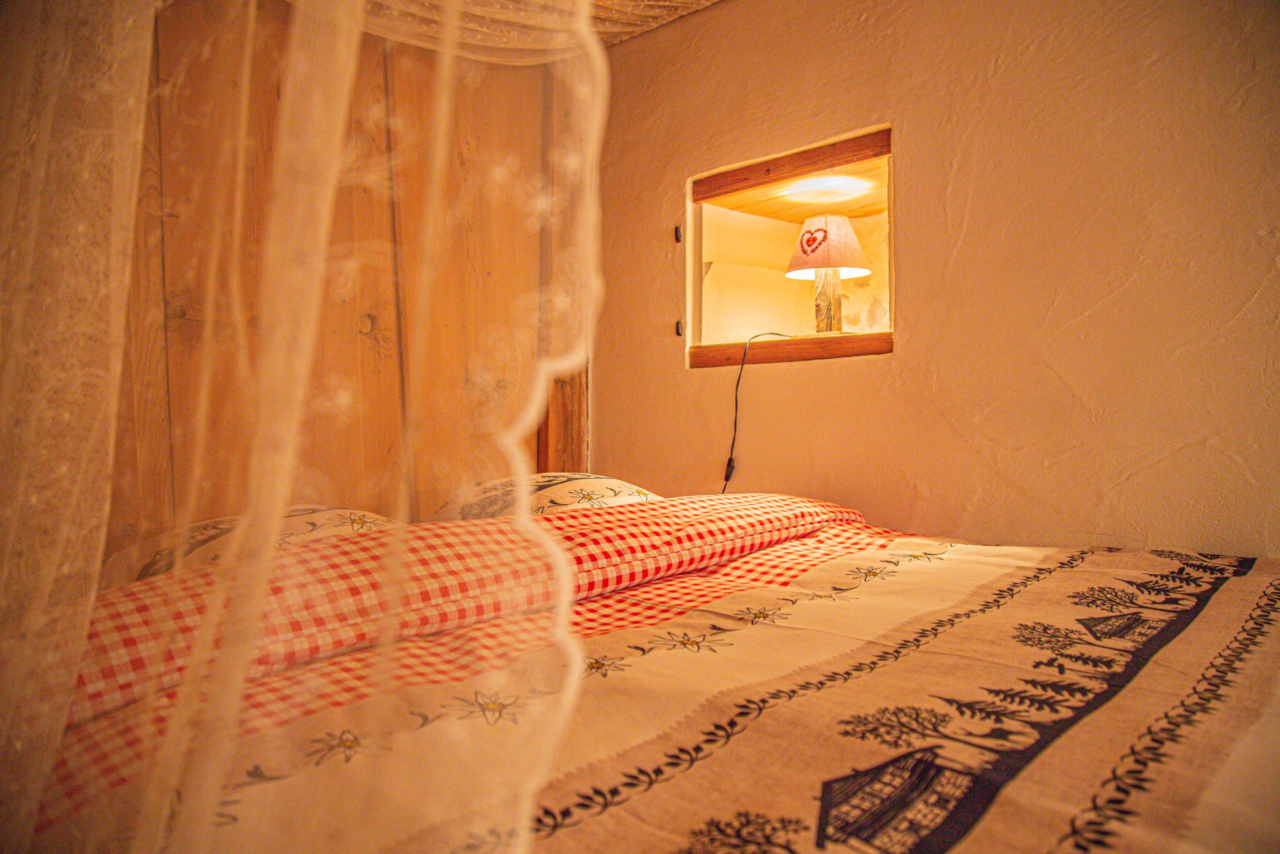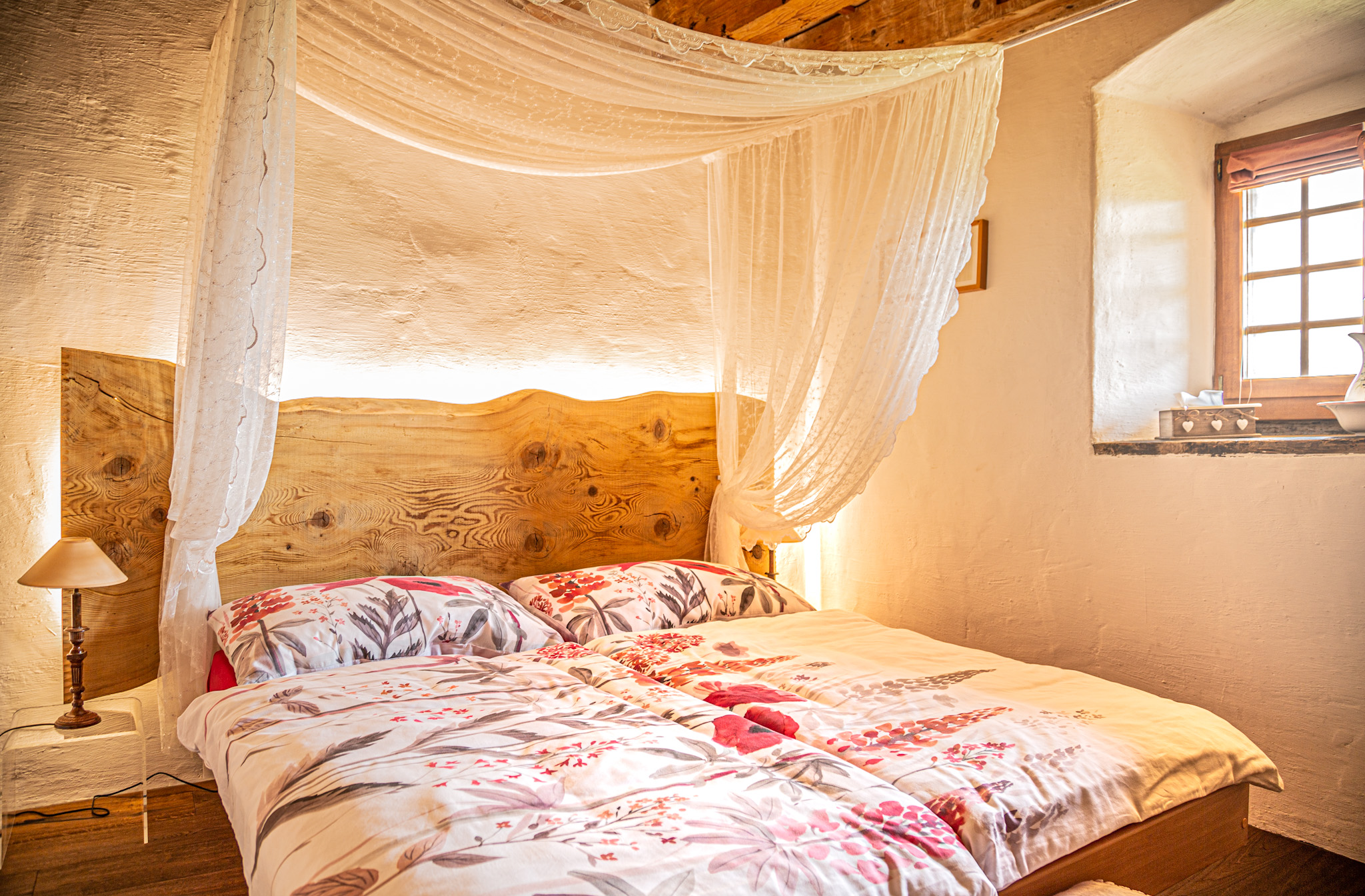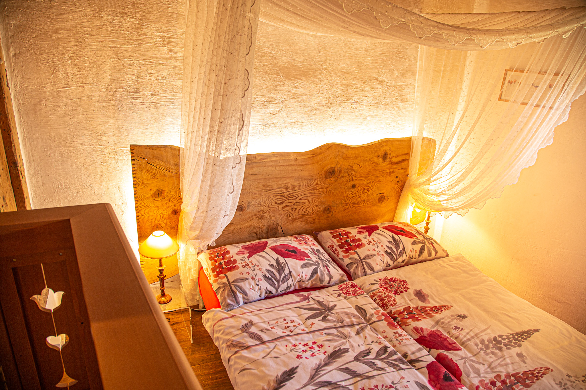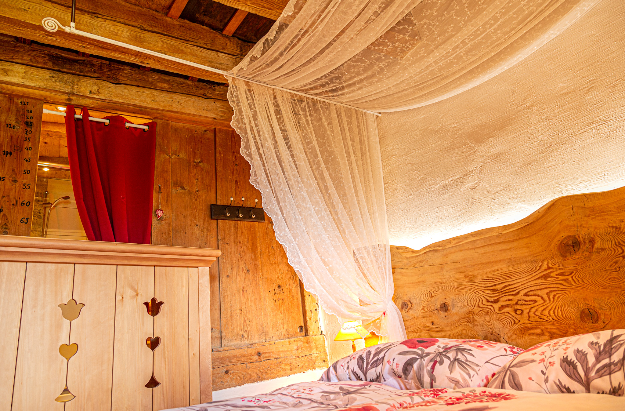 Notre unique chambre côté montagnes ! Son balcon interne menant à la salle de bain privative lui confère un décor inédit qui inspire la rêverie. Petit cocon cosy avec lit de 180 x 200 cm constitué de deux matelas de dureté moyenne 90 x 200. Tête de lit lumineuse en une seule planche de bois massif. Voile de dentelle blanche. Inclus :