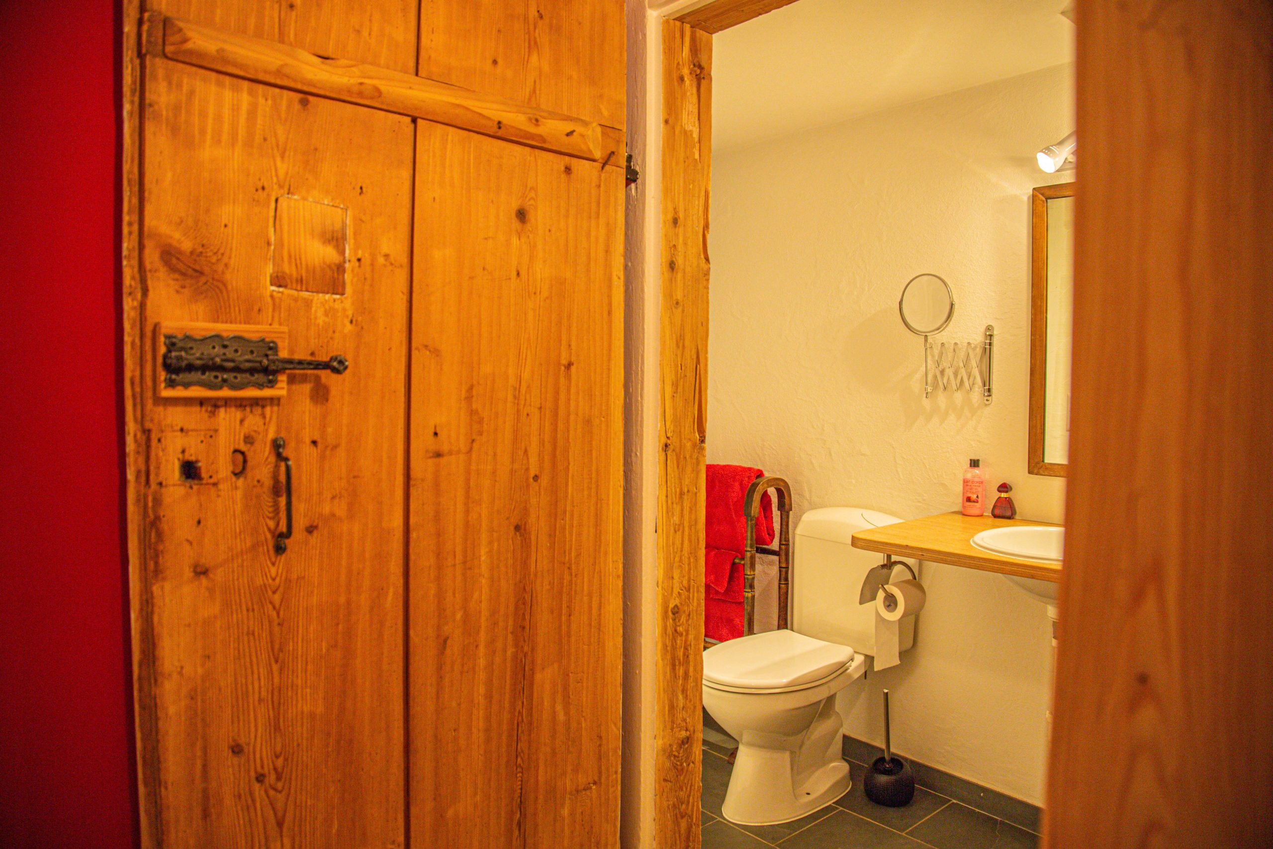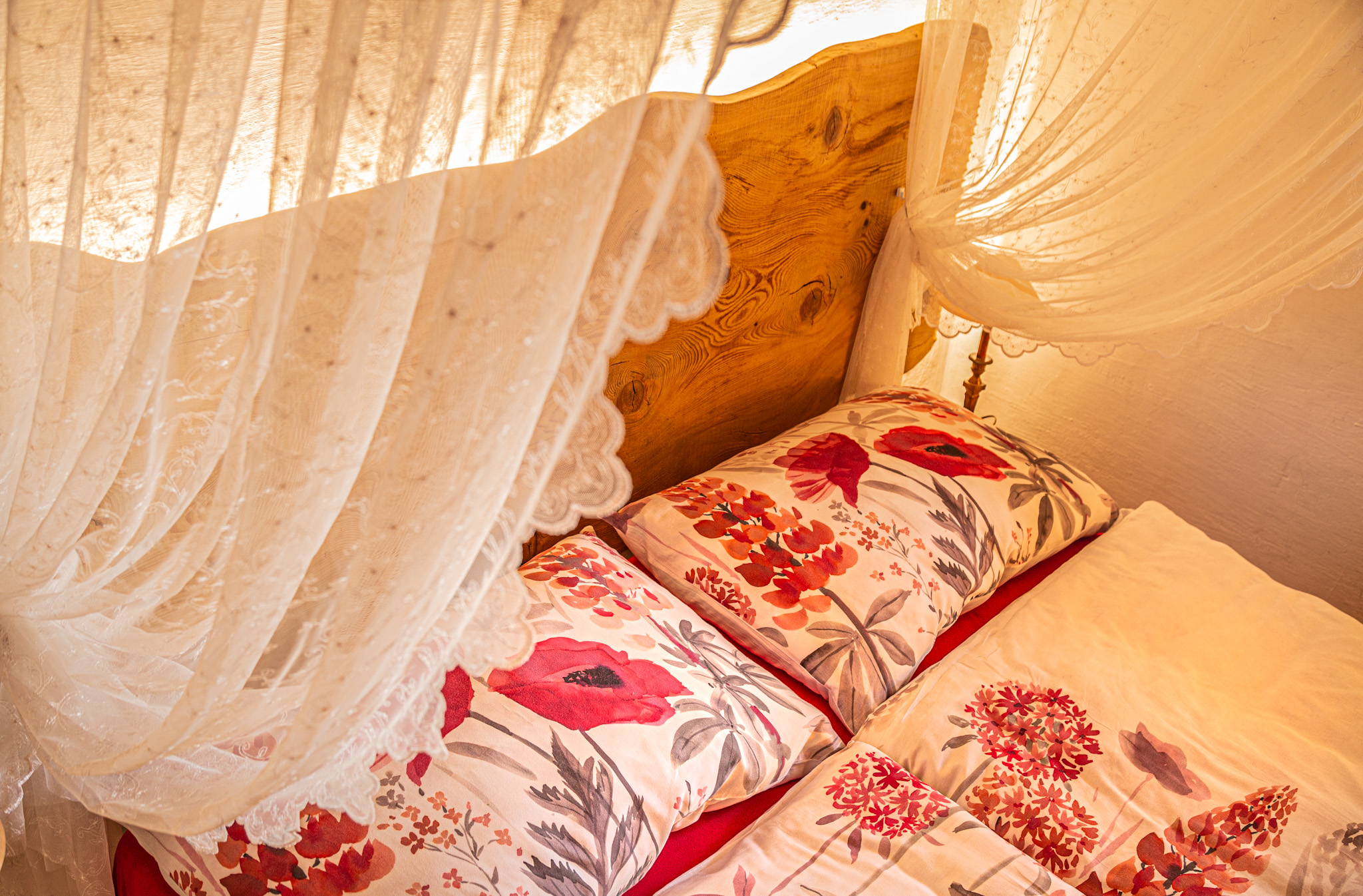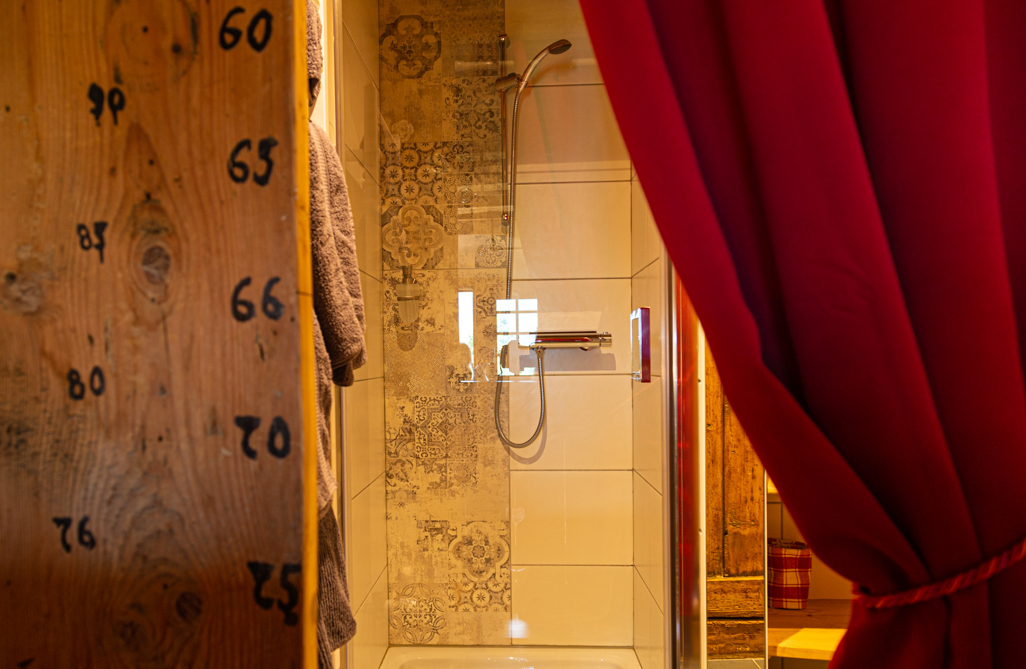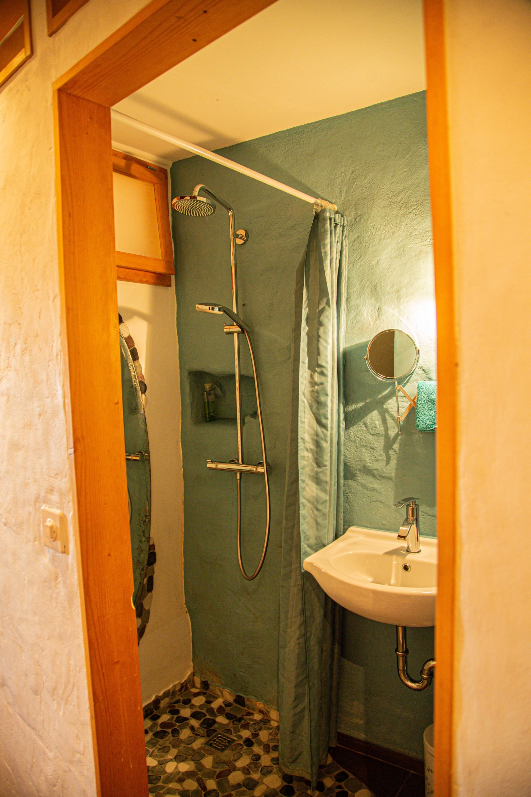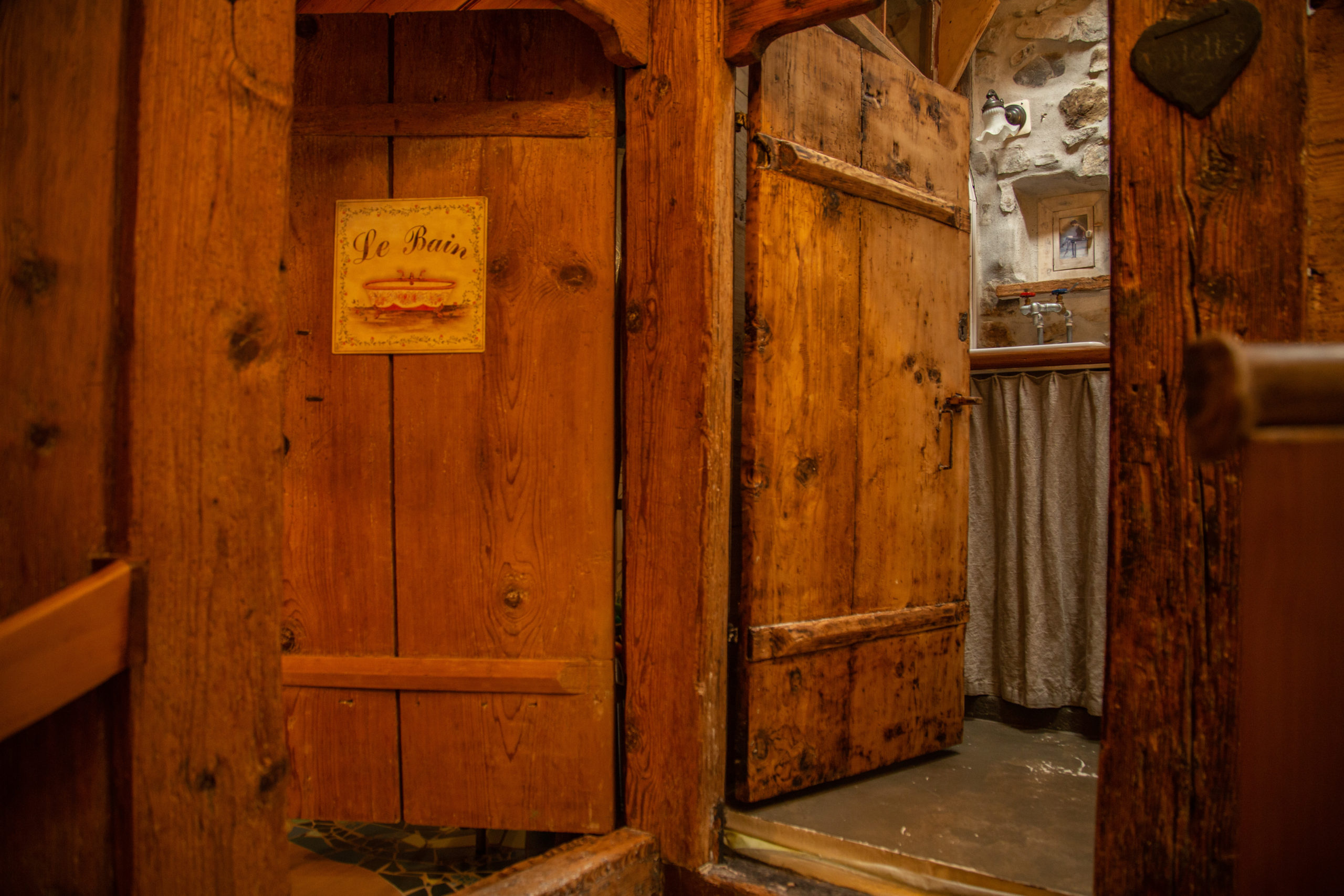 En-dessus, les portes de la salle de bain et du wc séparé datent du 14e siècle environ. La baignoire sur pieds et le hammam en mosaïque artisanale constitue un véritable espace bien-être. A côté, vous dormiez dans une grande chambre à coucher avec un lit à baldaquin.