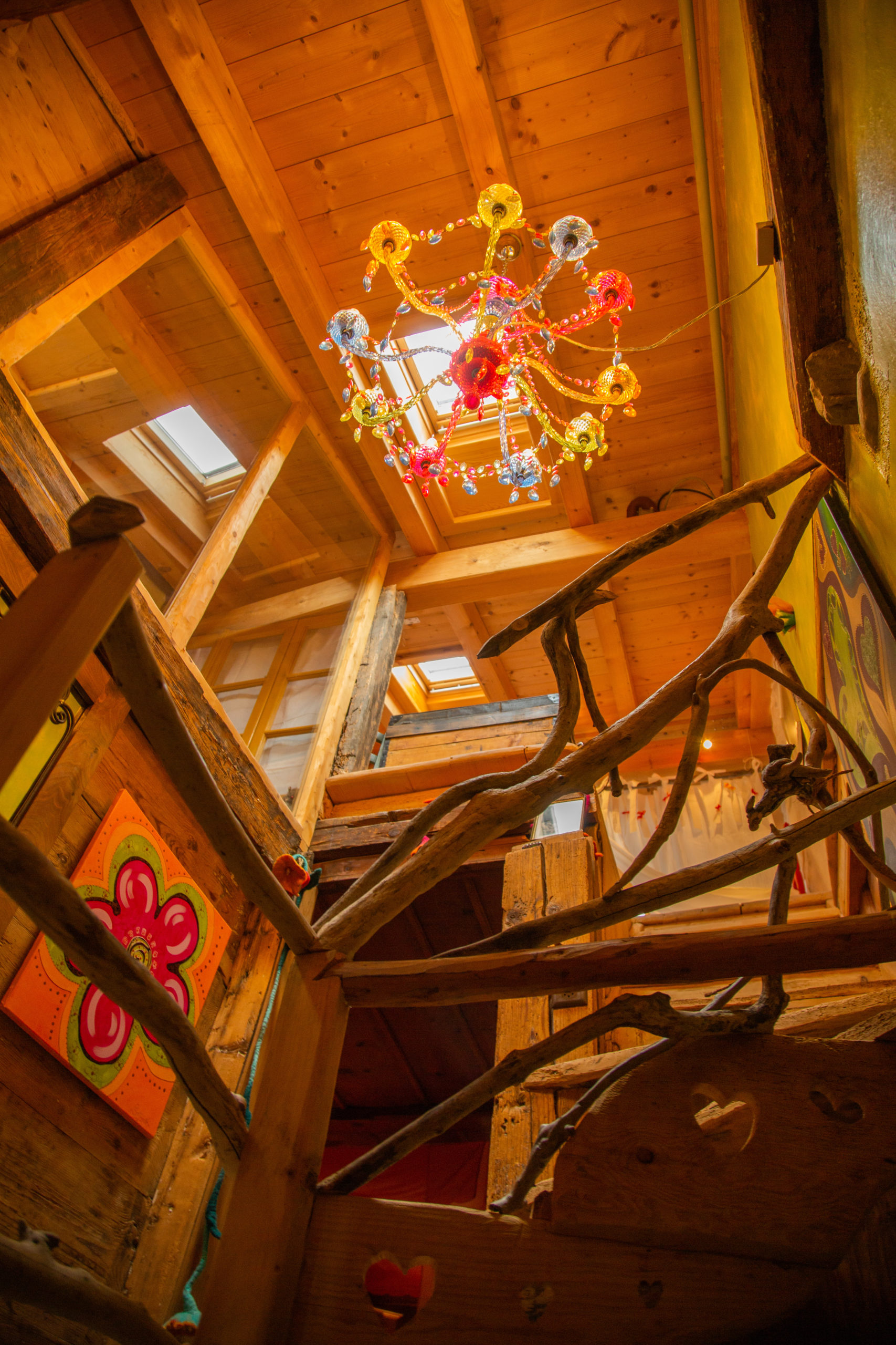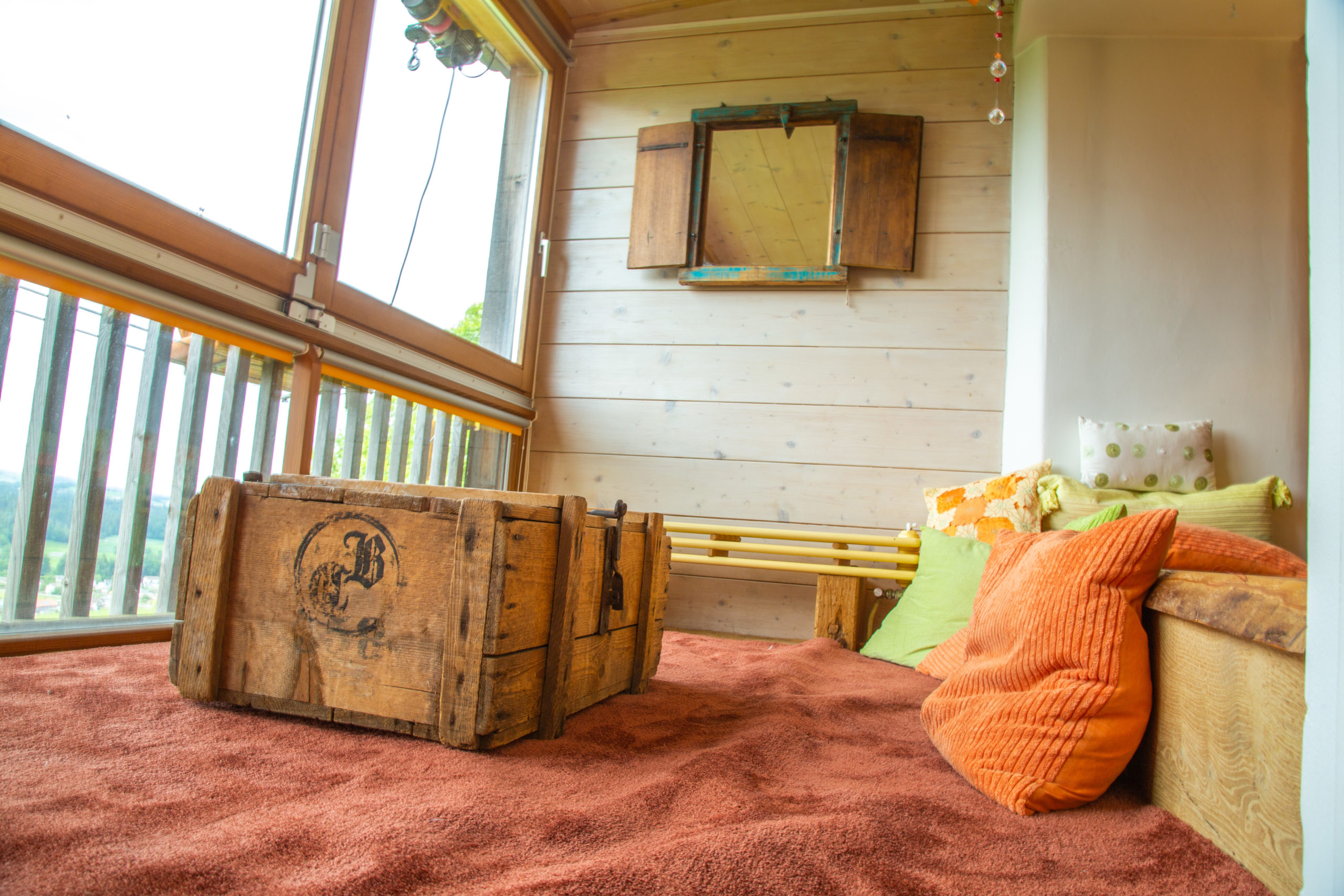 La mézzanine du 3e étage est idéale comme coin de lecture et dispose d’un futon et d’un lit double ou séparé.