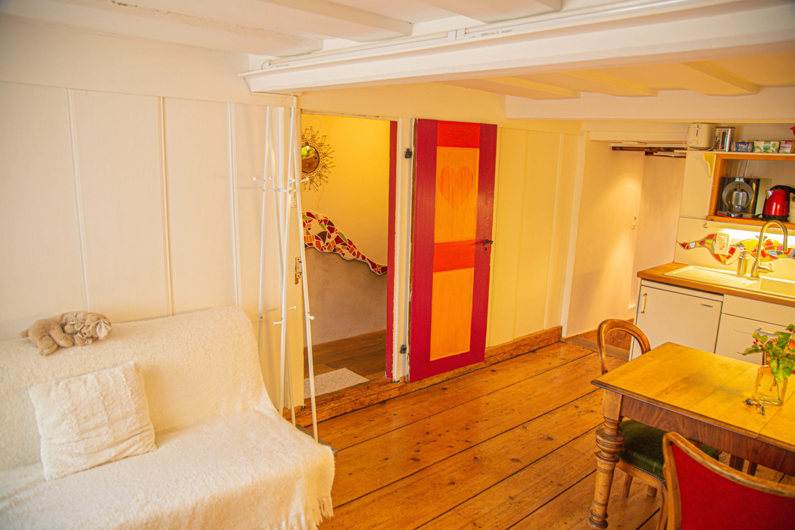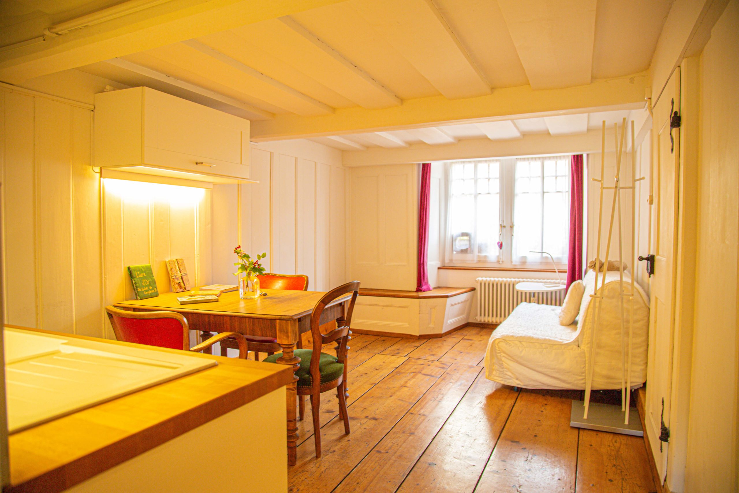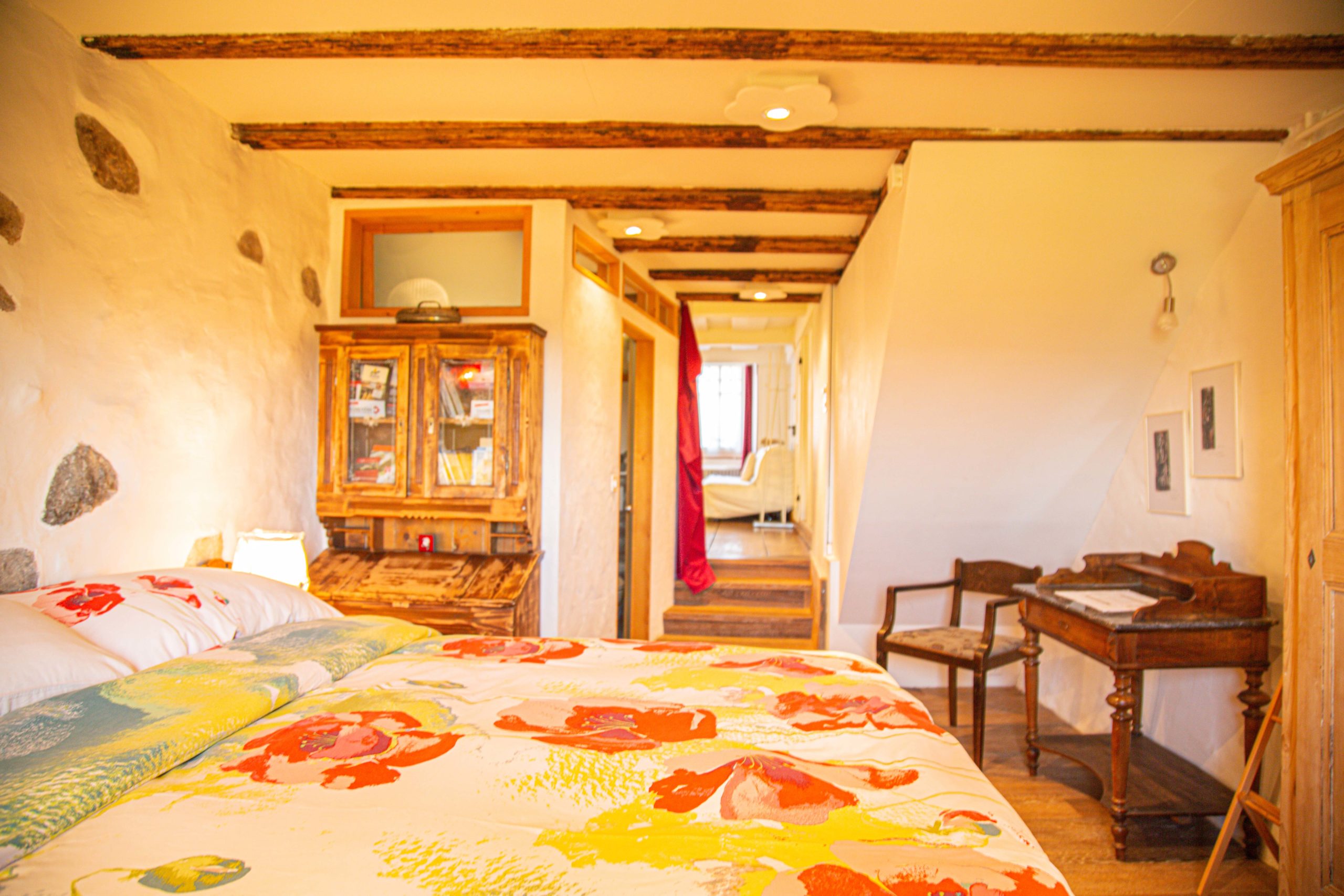 Petit cocon cosy avec lit de 160 x 200 cm et matelas de dureté « ferme ». Cachet de l’historique fourneau à mollasse remis en fonction (pour une atmosphère incomparable, feu sur demande contre supplément). Tringles en bois flotté. Fenêtre donnant sur le bourg médiéval piéton, en face du Calvaire qui est une petite chapelle abritant des expositions artisanales hebdomadaires. Inclus :